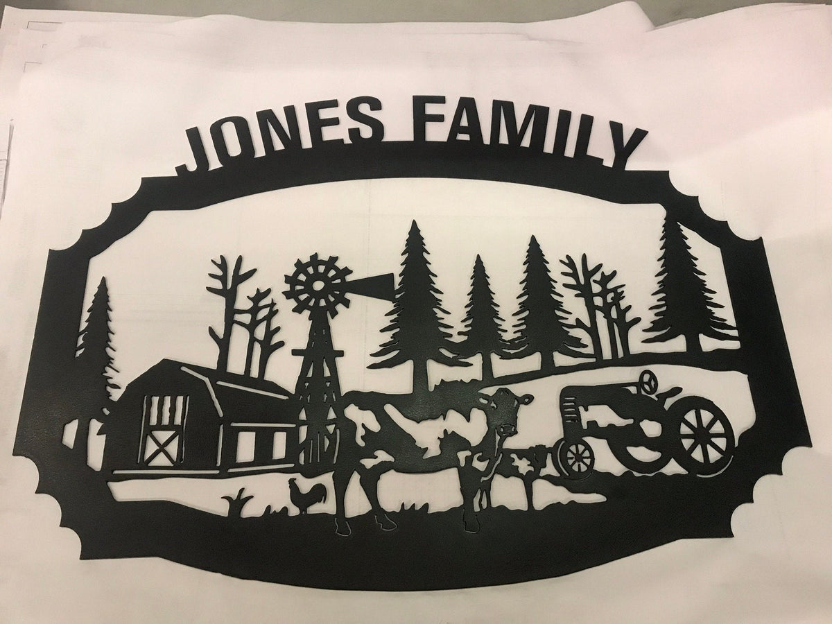 personalized metal sign with farmyard scene .Included with the price is customizing with your name.Our finish is a baked on powder coat for a very long lasting durable finish. This will be made from heavy 10ga steel.PLEASE LEAVE NOTE TO SELLER WITH NAME AND OR EST. DATE YOU WANT ON SIGN