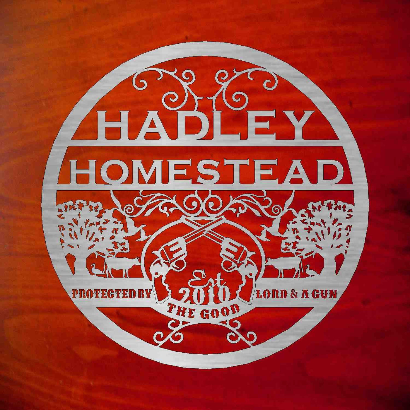 personalized metal sign with cows guns scene .Included with the price is customizing with your name.Our finish is a baked on powder coat for a very long lasting durable finish. This will be made from heavy 10ga steel.PLEASE LEAVE NOTE TO SELLER WITH NAME AND OR EST. DATE YOU WANT ON SIGN