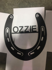 this is a custom made to order horse shoe horse name plate it is 12"x13" 14 ga metal powder coated i can powder coat is any color does not have to be black