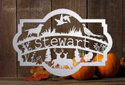 Custom Metal Sign welcome or personalized with hunting scene 32012 3' wide personalized metal sign with hunting scene .Our finish is a baked on powder coat for a very long lasting durable finish. This will be made from heavy 10ga steel.