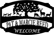 Bring a warm rustic welcome to your home, farm, cabin, or ranch with this custom 10-gauge steel metal sign. Featuring an oak tree, deer, hunting dogs, and flying birds, this scene is perfect for nature lovers and hunters alike. The WELCOME banner and personalized name line make it the perfect gift or addition to your property. PLEASE LEAVE NOTE TO SELLER WITH NAME AND OR EST. DATE YOU WANT ON SIGN