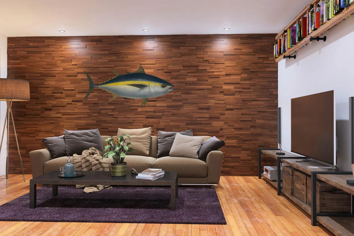 Custom printed Yellow Fin Tuna Fish metal sign Custom Shape UV printing for durable finish Made for exterior or interior. will not rust Aluminum front and back composite Premium Quality .24" thick JBond Panels are manufactured to meet the highest industry standards. holes for hanging Crafted from a composite material, they are known for their exceptional strength, rigidity, and durability. These panels are engineered to withstand the test of time. Architectural Versatility: JBond Panels are not limited to signage alone. They are a favorite choice for architectural applications, including exterior cladding, building fascias, and interior wall paneling. Their adaptability makes them an excellent choice for enhancing the aesthetics of any space Easy Installation: JBond Panels are easy to handle and install. They can be mounted on walls, posts, or frames with ease. The lightweight yet sturdy nature of these panels simplifies the installation process.